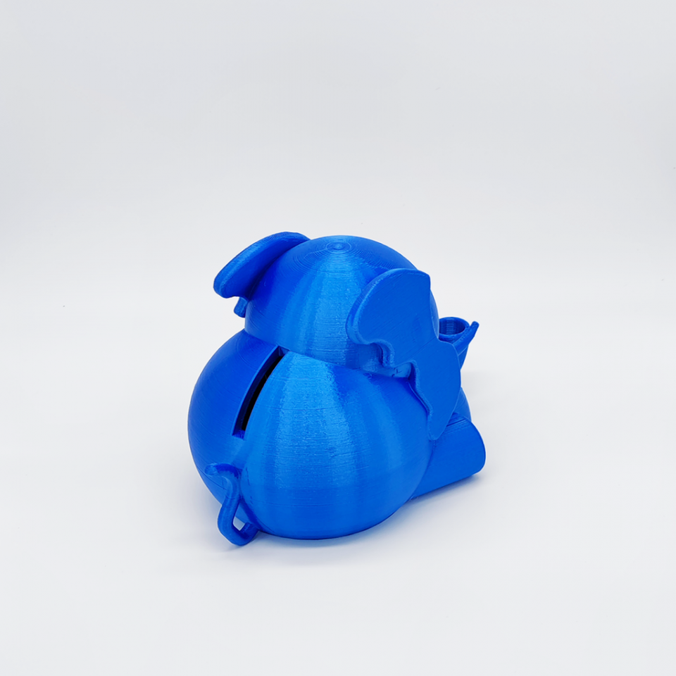 Notre Tirelire Éléphant France Bleu est un produit imprimé en PLA. Il s’agit d’un bioplastique, issu généralement d’amidon de maïs, mais aussi de cannes à sucre, betterave, etc. Il est biodégradable en conditions industrielles, ainsi que recyclé par des start-up. Dans son état « naturel » le PLA est beige et légèrement translucide. Les filaments PLA pour imprimante 3D comportent des pigments afin d’obtenir une coloration.